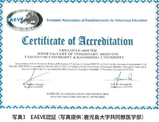 2019年12月11日に鹿児島大学及び山口大学の共同獣医学部は、欧州獣医学教育機関協会(EAEVE; European Association of Establishments for Veterinary Education)の獣医学教育国際認証を取得しました(有効期間は7年間)(写真3)。
