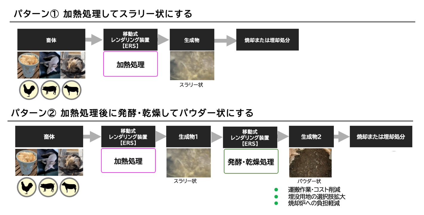 株式会社JETは急速発酵乾燥資源化装置「ERS(Environmental Recycling System)」を開発したプラントベンチャーで、新規の移動式レンダリング装置もそれを利用したもの。ERSには「発酵・乾燥」機能があり、その乾燥度合いを機械的にコントロールできる。レンダリング装置にも付属機能として「発酵・乾燥」機能が位置づけられており、約4時間の発酵・乾燥処理を行い、含水率28.9%の生成物が得られたことも確認された。水分の低減は生成物の減容化・減量化に直結し、また発酵により生成物の臭い問題を軽減することも期待できる。