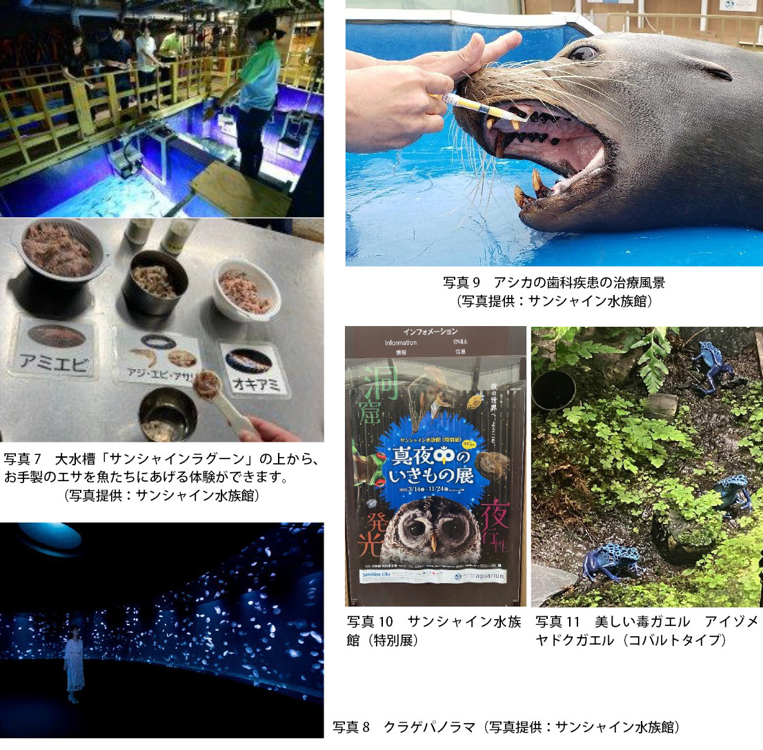 - 2011年に誕生しました。45種類1500尾の魚たちが暮らしている、サンシャイン水族館で一番大きな水槽です。視覚効果を利用して実際の奥行きや高さよりも広く感じるように工夫しました(写真6)。大水槽「サンシャインラグーン」の上から、お手製のエサを魚たちにあげる体験ができます。具体的には飼育スタッフが調餌場(ちょうじば)という生き物たちの台所へご案内します。水族館で使っているエサの種類などについてお話をした後、ご自身でエサを混ぜて作っていただき、魚たちにあげることができます(写真7)。