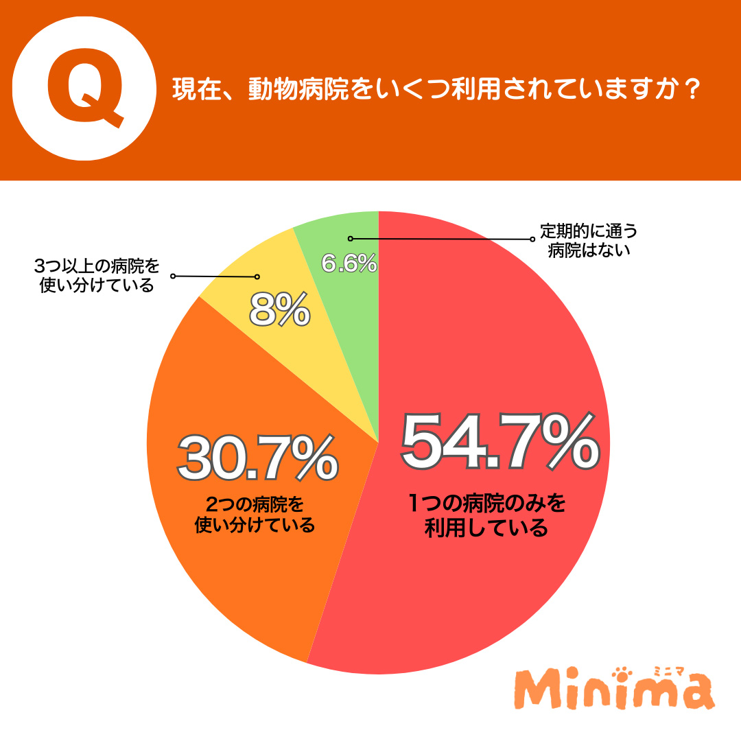 現在の動物病院の利用状況については、「1つの病院のみ利用している」が75名(54.7%)で最も多く、「2つの病院を使い分けている」が42名(30.7%)、「3つ以上の病院を使い分けている」が11名(8.0%)と、合計で45.3%の飼い主が複数の動物病院を利用していた。