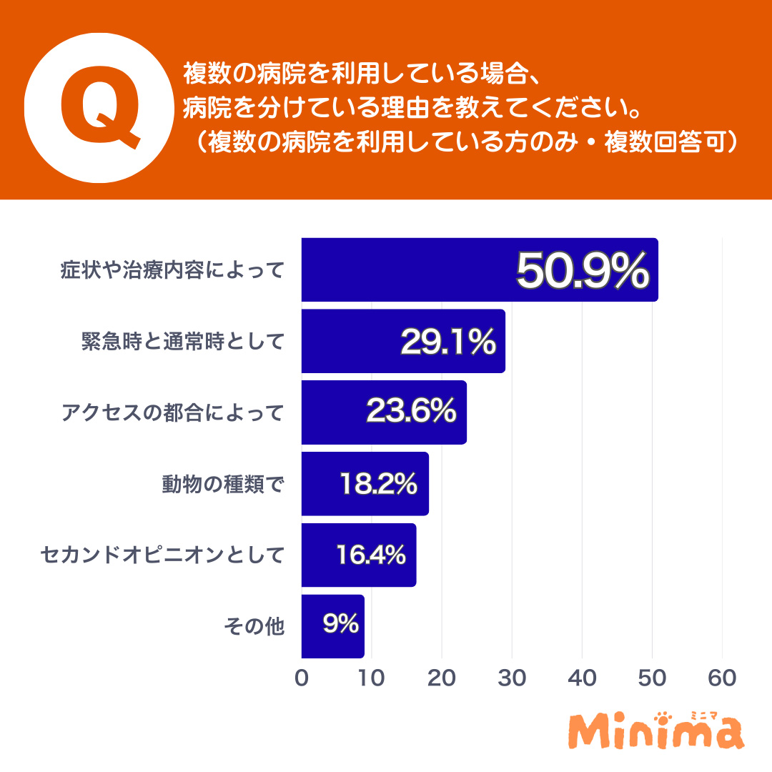 複数の動物病院を利用している53名に、その理由を尋ねたところ、「症状や治療内容によって使い分けている」が28名で最も多く、次いで「緊急時用と通常診療用で分けている」が16名、「立地・アクセスの都合」が13名という結果。