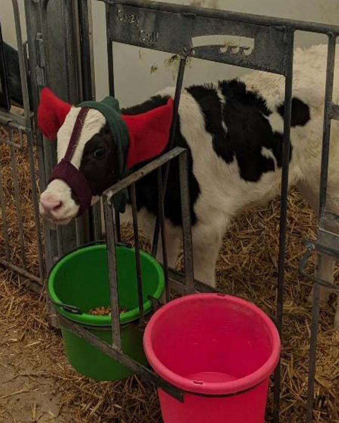 搾乳牛舎はフリーストールで、初産牛群と経産牛群に分かれており、フレッシュ牛群は別牛舎で飼養されています。サイクロンファンと換気扇によるハイブリッド換気システム、砂ベッドのストール、目地の細かい通路の溝、至る所にカウコンフォートを重視していることが感じられました。ストールにはサンドセイバーと呼ばれる有孔マットを敷き砂の流出を防止するだけでなく、ベッドの砂は2週間で3回足され、搾乳ごとにベッドメイクされています。育成牛は離乳後から初回分娩の分娩房までが横並びに群分けされて飼養され、ほぼ自家育成です。哺乳牛舎には約50個のハッチがあり、陽圧換気システム、各ハッチの地面には暗渠設備、空気で膨らませる牛舎カーテン(とても暖かいが閉まるまで時間がかかるとのこと)といった初めて見る設備が多くありました。冬場は外気がマイナス30℃まで下がるようですがヒーターはなく、凍傷防止のイヤーカフを装着すると紹介してくれました(写真2)。この他にも、フレッシュ牛舎・共進会牛用飼養スペース・乾乳牛舎・分娩舎と全ての牛舎を見せていただきましたが、どこの牛も体型が揃っており毛艶もピカピカしていました。