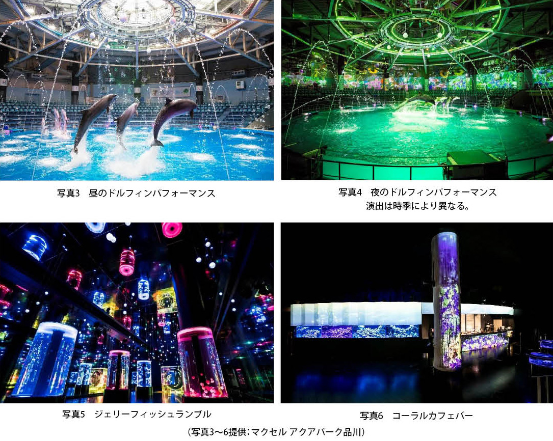 パワーコンテンツの「ドルフィンパフォーマンス」は四季のみならず、昼夜でも内容が異なります。日中のプログラムは、ダンスや簡単な振り付けで会場一体となってお楽しみいただくゲスト参加型の演出を取り入れ、夜は暗転した円形会場に360度プロジェクションマッピングを投影。四季折々の華やかな舞台でイルカたちがダイナミックなパフォーマンスを披露します(写真3、写真4)。