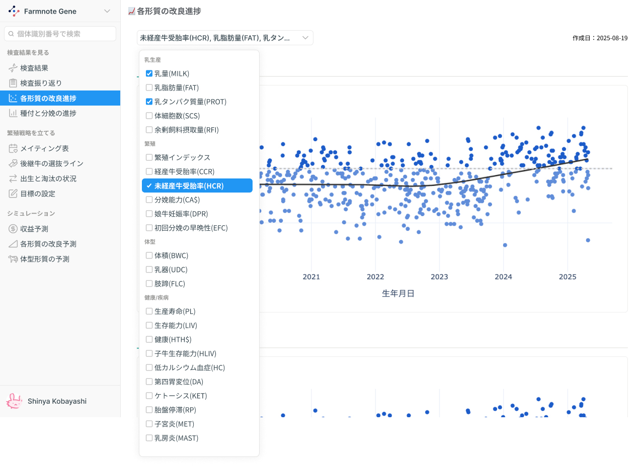 - ゲノム検査データを元に、最も利益の出る運営シミュレーションの提示。育種改良進捗の確認、後継牛確保計画の自動策定、改良のベンチマークを行う。