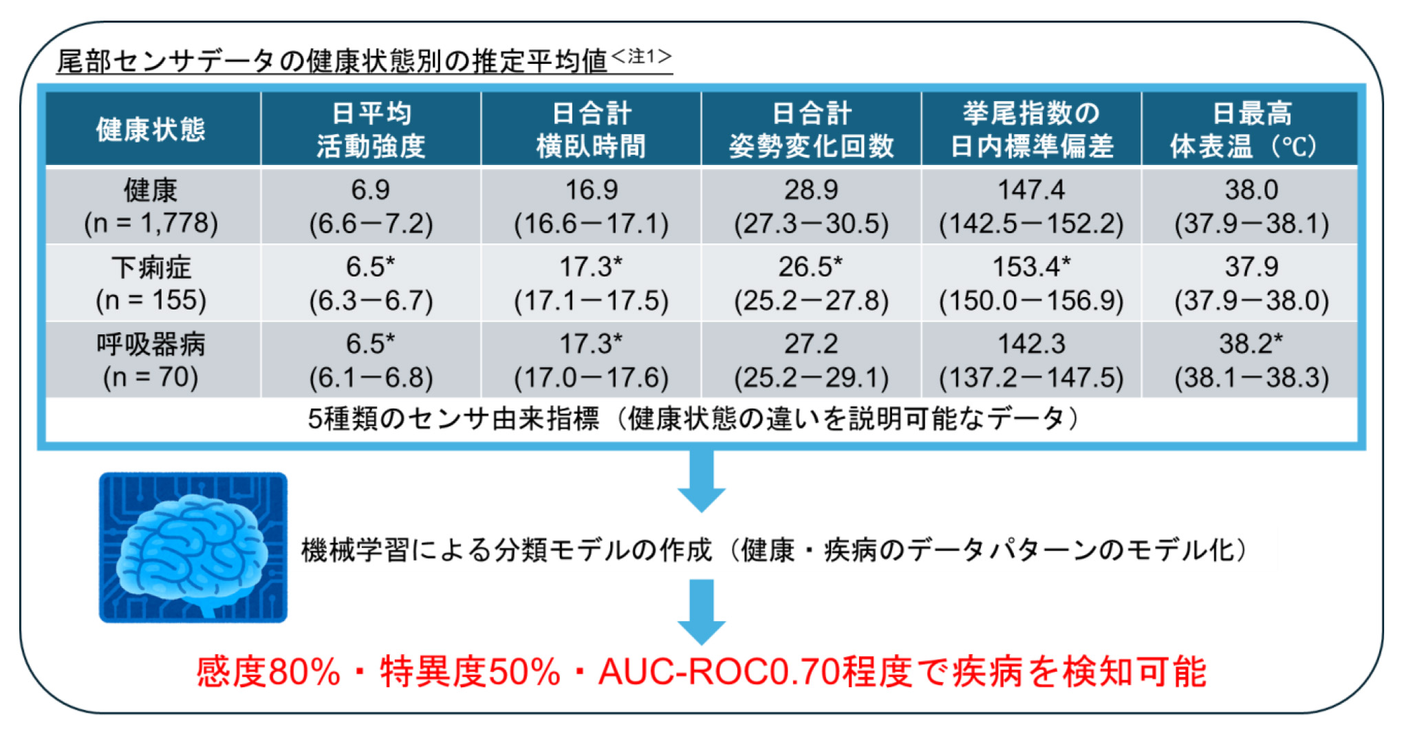 農研機構、麻布大学、北海道立総合研究機構、明治大学、全国酪農業協同組合連合会の共同研究グループは、2026年1月27日、多機能尾部装着型ウェアラブルセンサを用いて実施した大規模なフィールド試験の成果を発表した(農研機構「プレスリリース」)。独自に開発した多機能尾部装着型ウェアラブルセンサを用い、約300頭の子牛を対象とした大規模なフィールド試験を実施。得られたセンサデータから、疾病に罹患した子牛は健康な子牛に比べて活動強度が低く、横臥(伏せている)時間が長く、体表温が高い傾向が見られた。これら複数の指標を総合的に解析し、機械学習を活用して疾病検知モデルを構築した結果、子牛の疾病を一定の精度で判別できることを実証した。
