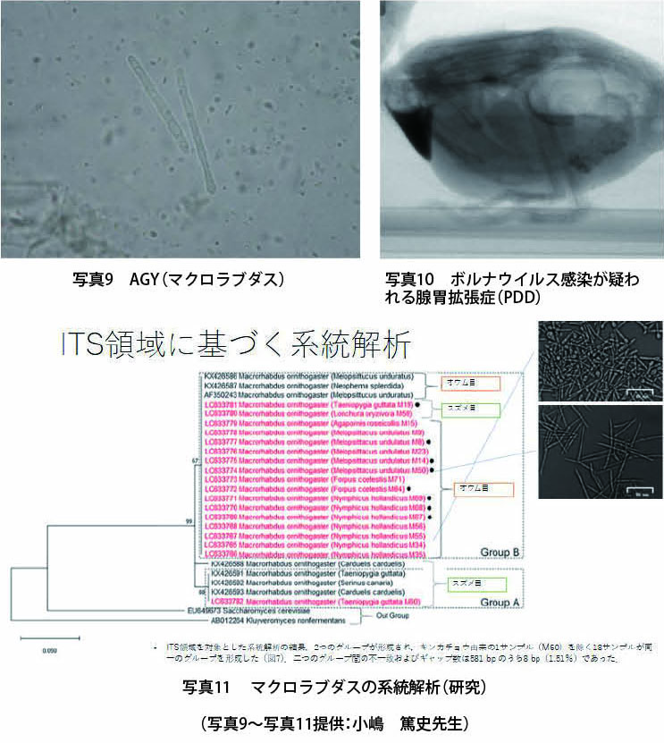 Q16.小嶋先生の著書『コンパニオンバードの病気百科』(写真8)では、AGY(マクロラブダス・写真9)の疾患数がセキセイインコでは89、オカメインコが29、カナリアとフィンチが26となっています。一方、神経節炎(PDD・写真10)はコンゴウインコが174、ヨウムが115、バタンが72、コニュアが60となっています。どちらも胃の疾患でありながら、罹患しやすい鳥種が異なるのは何故でしょうか?