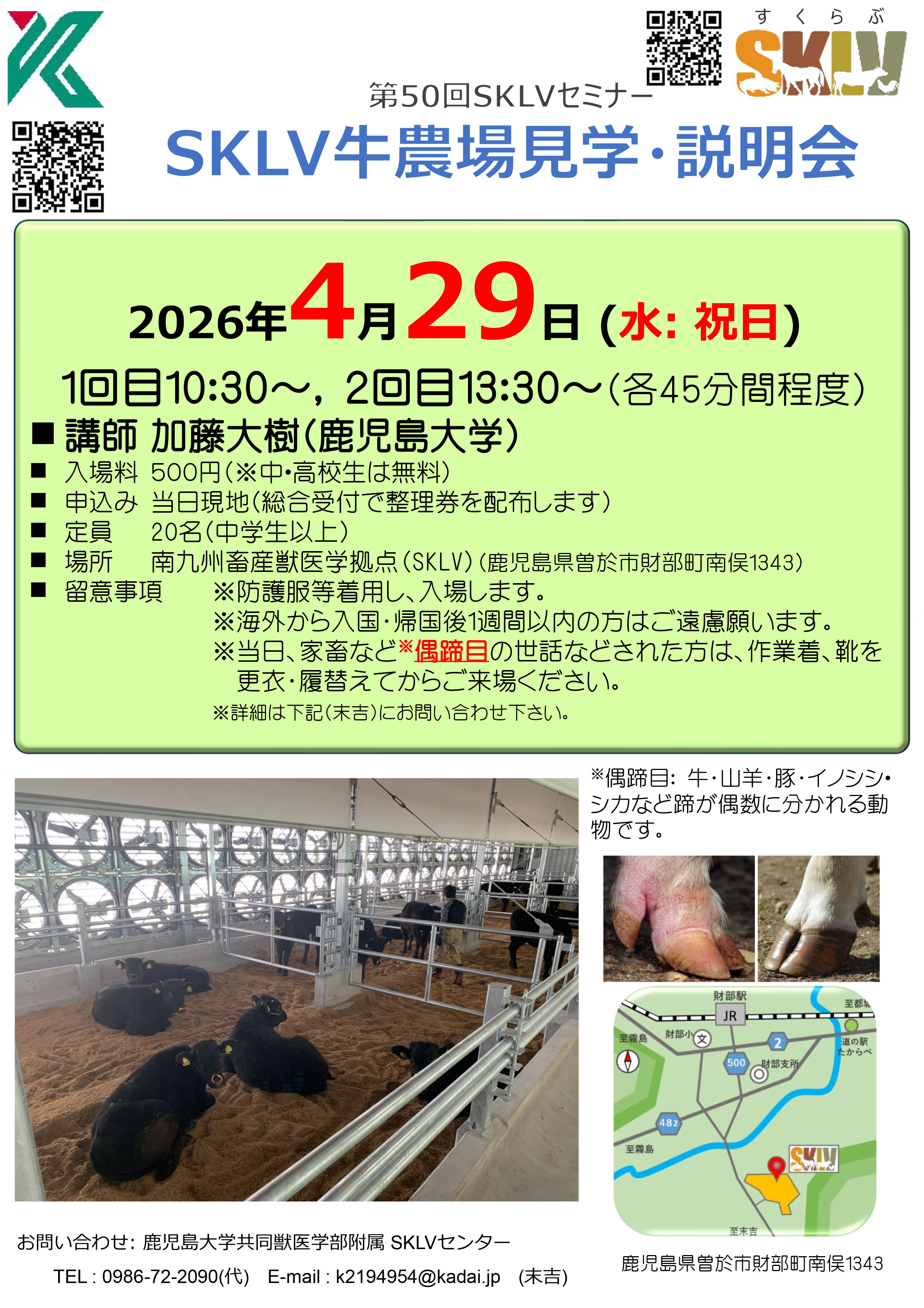 鹿児島大学共同獣医学部附属SKLVセンターは、2026年4月29日、中学生以上を対象とした牛農場見学・説明会と、3歳~高校生を対象とした馬・牛・豚・鶏さんの獣医師体験のイベントを実施する。