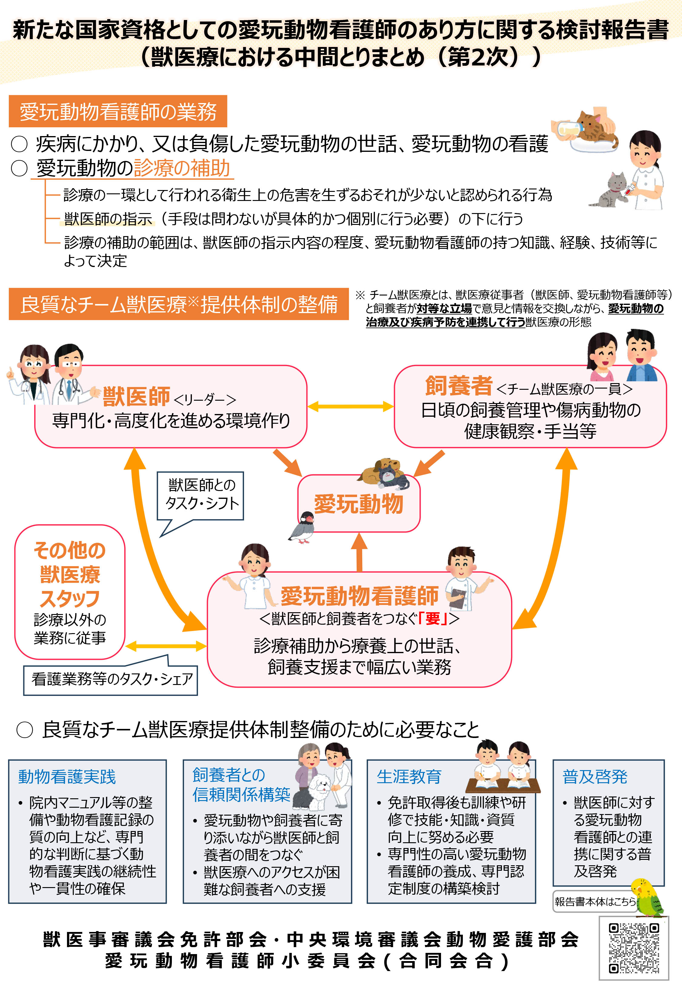 農林水産省は、2026年4月15日、「新たな国家資格としての愛玩動物看護師のあり方に関する検討報告書-獣医療における中間とりまとめ(第2次)」を発表した(農林水産省「新たな国家資格としての愛玩動物看護師のあり方に関する検討報告書」)。農林水産省と環境省の両省で開催している「愛玩動物看護師小委員会」において討議されまとめられたもの。