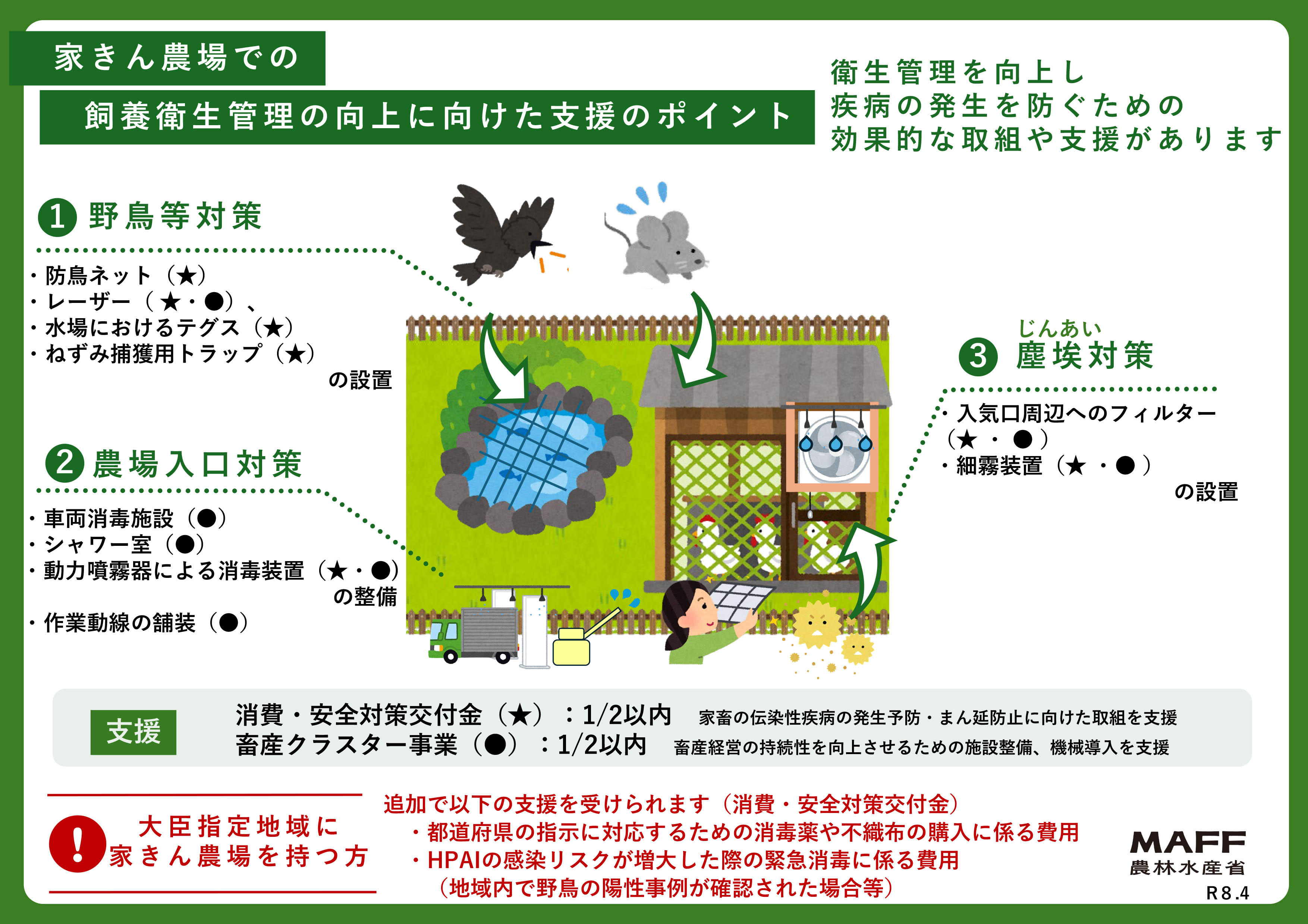 農林水産省は、2026年4月、「家きん農場での飼養衛生管理の向上に向けた支援のポイント」と「飼養衛生管理の高度化に取り組む家きん農場経営者の方への支援」のリーフレットをWebサイトに掲載した。