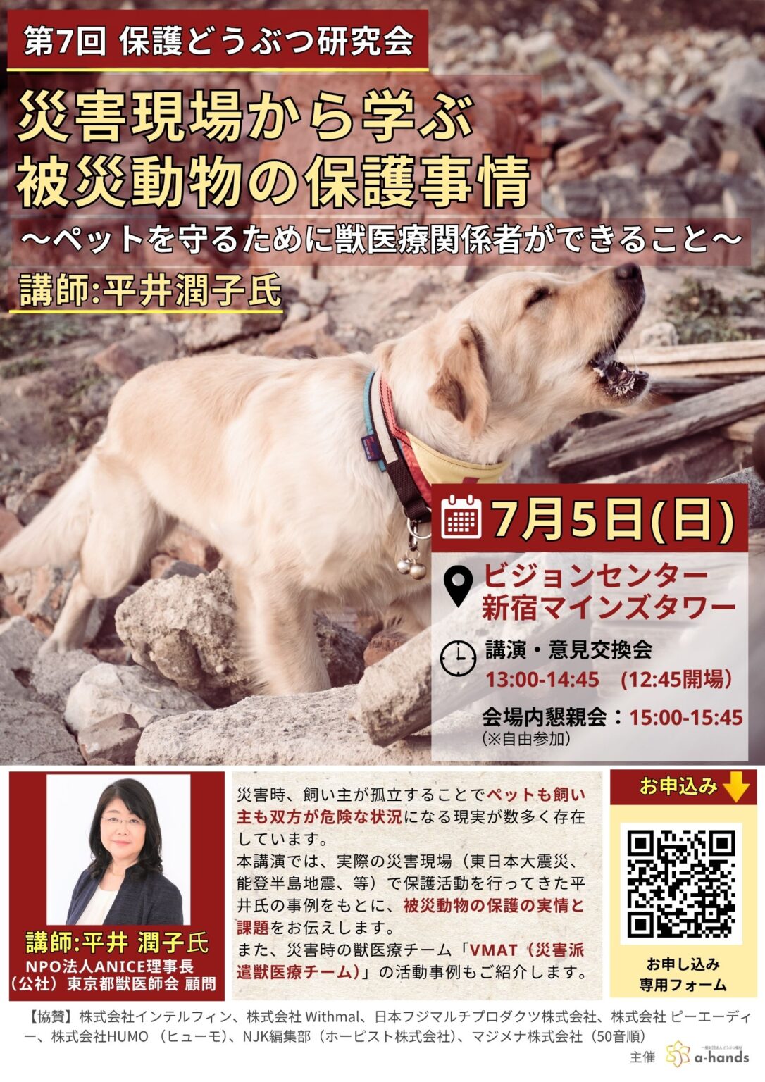 一般財団法人 どうぶつ福祉a-handsは、2026年7月5日、第7回「保護どうぶつ研究会」を東京で開催する。テーマは「災害現場から学ぶ被災動物の保護事情〜ペットを守るために獣医療関係者ができること〜」。